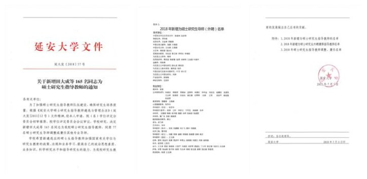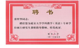 日前,延安大学下发了延大发〔2018〕57号文件《关于新增田大成等165名同志为硕士研究生指导教师的通知》,我院副院长张哲华副教授被聘为延安大学学科教学(英语)专业硕士研究生指导教师。