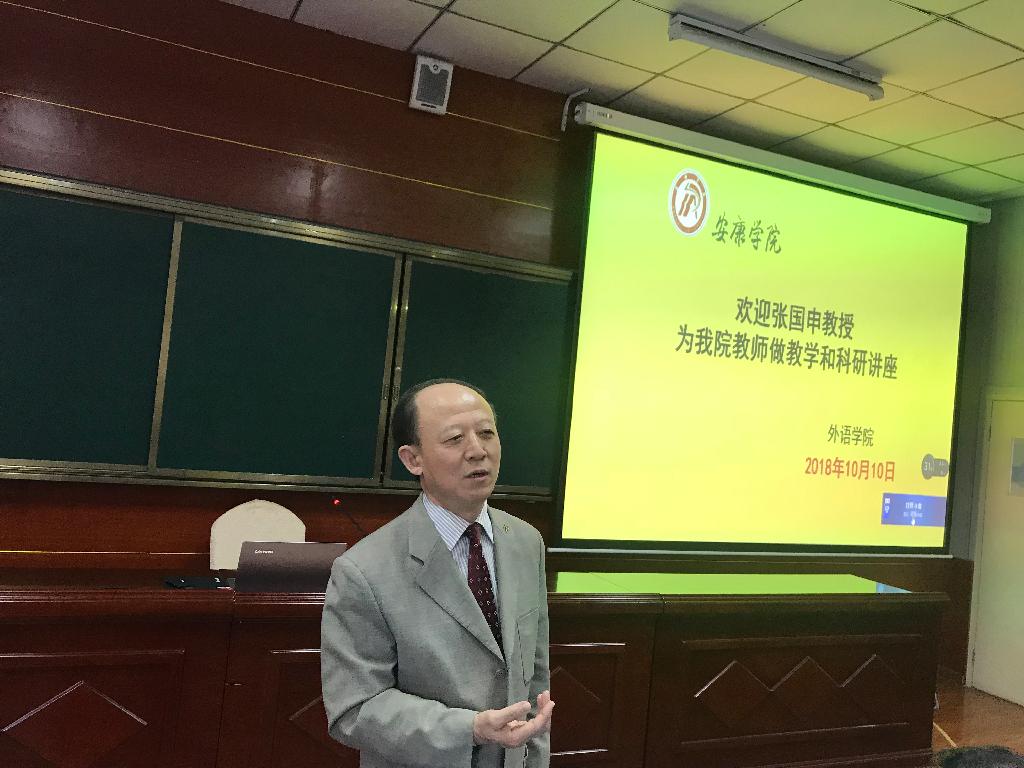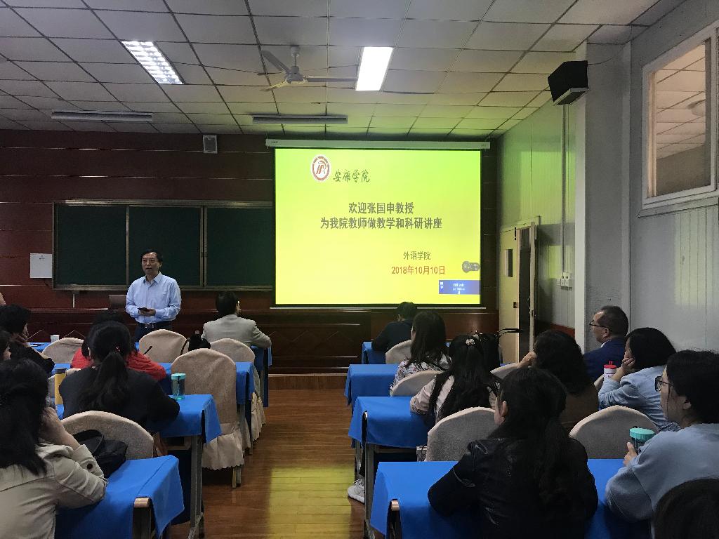 张国申教授首先提出“什么是教学?”,就RICH外语教学理念,EGP、EAP、ESP、ECP多种外语教学形式,教师从教学型向科研型转变路径等为老师们进行了深入解读。随后,张教授从科研的定义出发,系统地阐述了科研过程、方法、原则和价值,结合学科特点和自身三十多年的科研经验,以案例形式给老师们讲解了论文撰写、申报课题的路径以及外语教师科研的常见问题。 会后,张国申教授还就老师们提出的教学与科研如何兼顾、大学英语ESP教学等问题进行了交流和探讨。