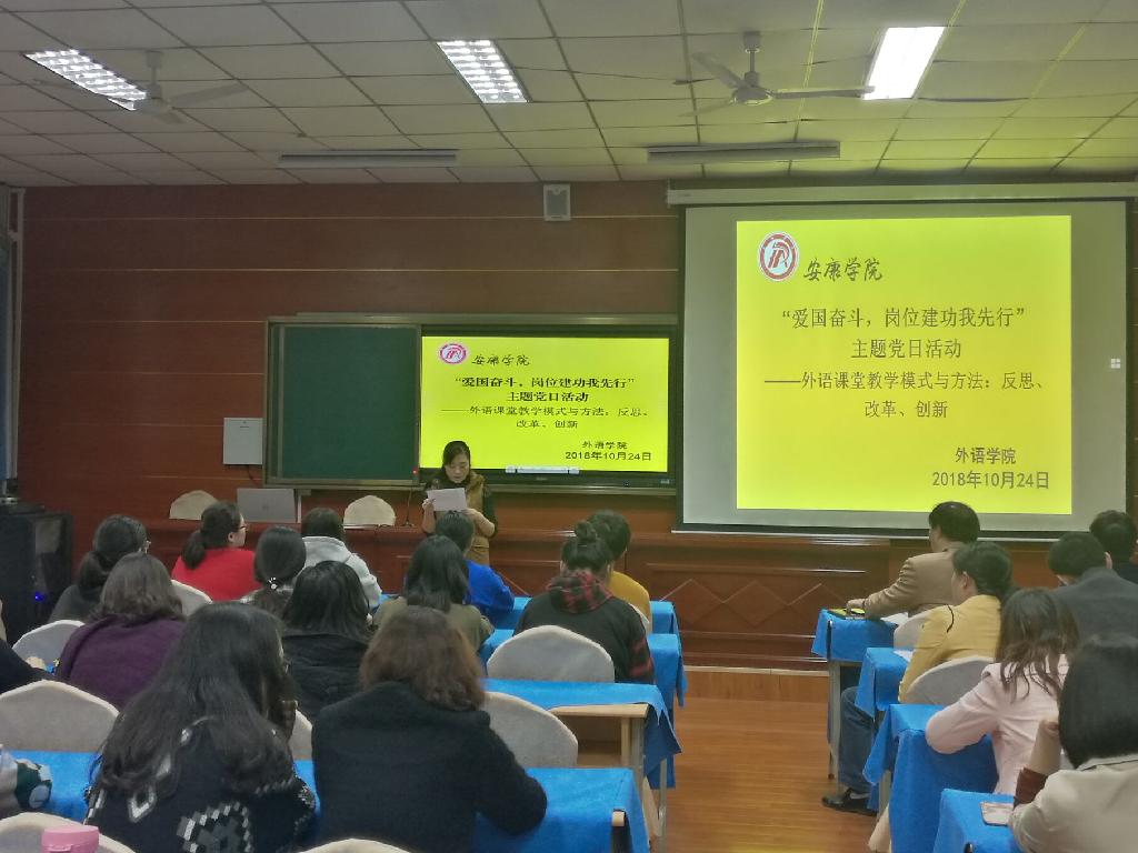为贯彻落实习近平总书记系列讲话精神及中共陕西省委高教工委、陕西省教育厅《关于在全省教育系统知识分子中深入开展“弘扬爱国奋斗精神、建功立业新时代”活动的实施方案》,大力推进党建工作与教育教学工作的有机融合,使广大师生将爱国奋斗精神化作工作、学习的具体行动,10月24日下午,外语学院党总支在1018多功能会议室举行了“爱国奋斗,岗位建功我先行”主题党日活动。本次活动以“外语课堂教学模式与方法:反思、改革、创新”为主题,展开课堂教学创新研讨。外语学院党总支(教工一党支部、教工二党支部、学生党支部)全体党员、教师及部分学生代表参加了此次党日活动,活动由外语学院副院长张哲华主持。