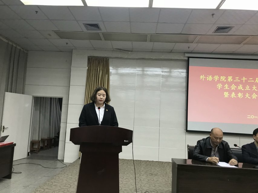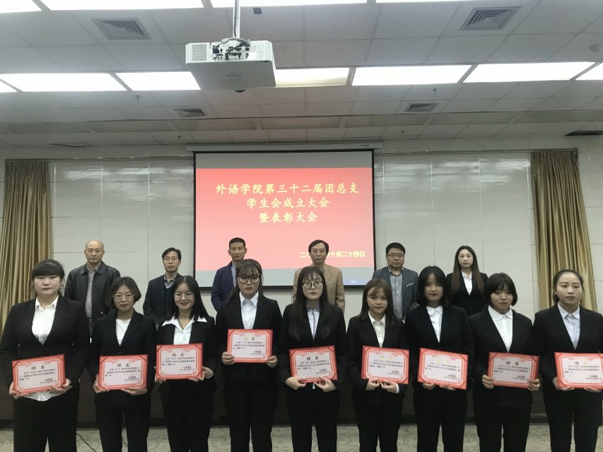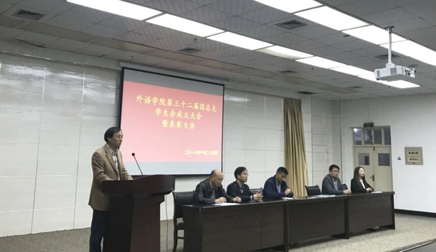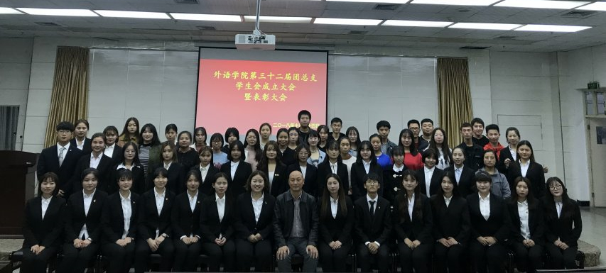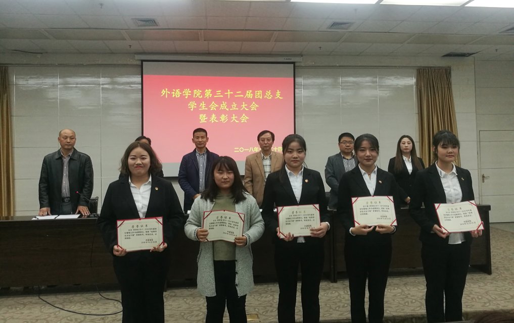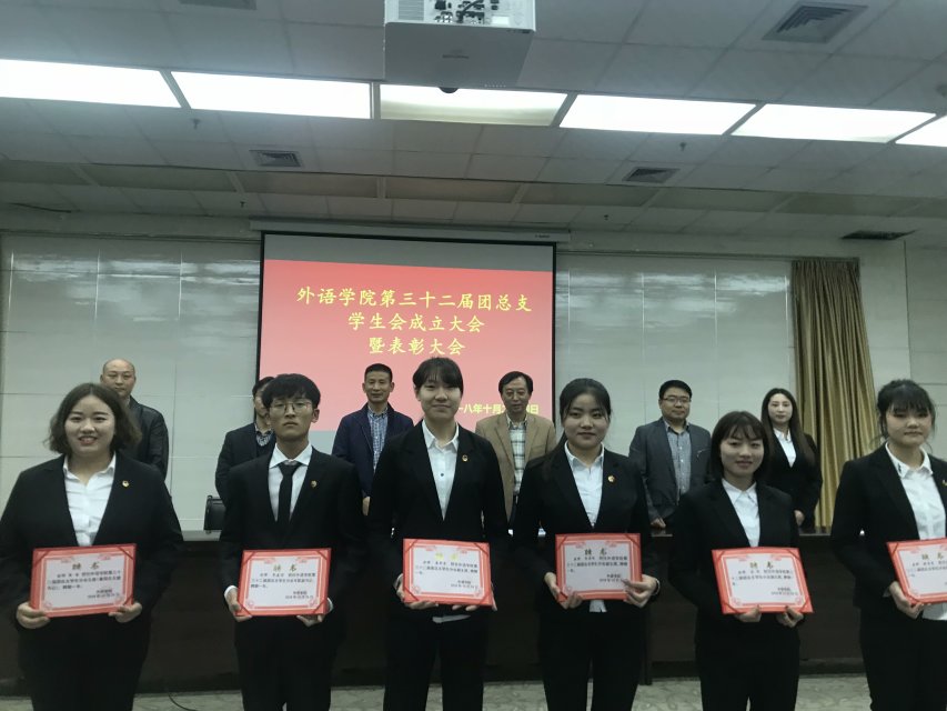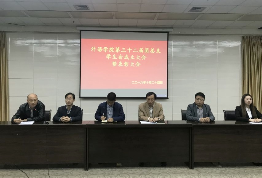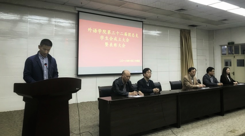 2018年10月24日晚19:30,外语学院第32届团总支、学生分会成立暨表彰大会在图书馆报告厅举行。外语学院院长哈红光、外语学院党总支书记郭家平、外语学院副院长张哲华、李继平,学工办主任兼团总支书记郝礼军以及第31届团总支、学生分会主席团成员和32届团总支、学生分会全体学生干部出席本次会议。大会由郝礼军主持。