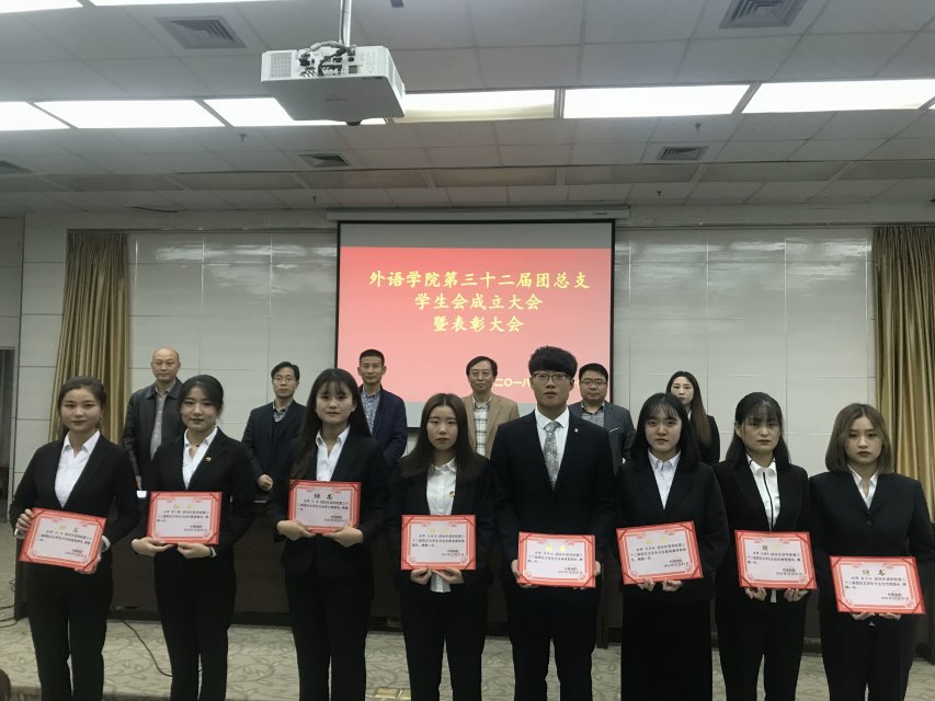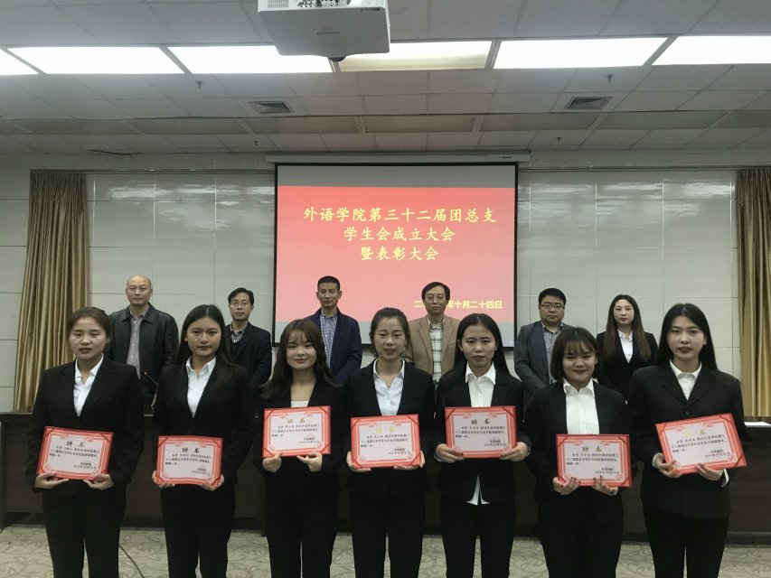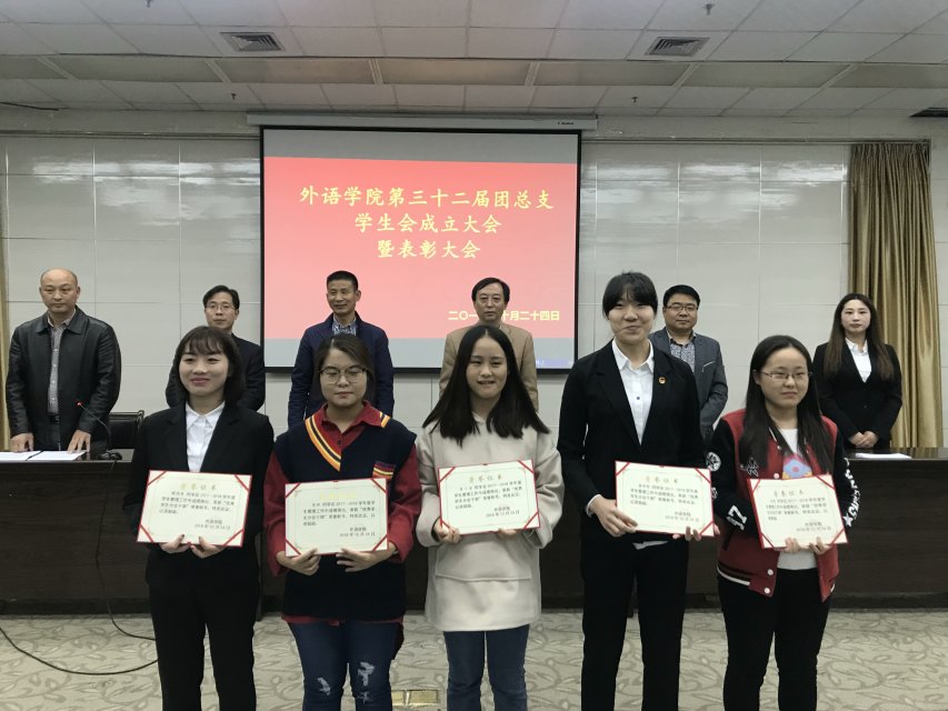外语学院领导为第31届团总支、学生分会优秀学生干部颁发荣誉证书,为第32届团总支、学生分会干部颁发聘书。