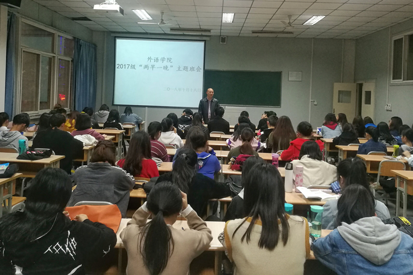 10月14日、10月18日,辅导员召开“两早一晚”主题班会,从开展“两早一晚”活动的具体内容、意义等方面向同学们进行讲解,以“为什么读大学”、“如何读大学”两个问题为切入点,启发同学们深入思考。要求大一年级坚持早起,上好早操,上好每一个晚自习。全院学生每天在教学楼前花园持之以恒开展30分钟早读;坚持每次课提前5分钟到教室,做好上课准备;要求学生在课前把手机关机或调为静音,不把早餐或零食带入课堂,杜绝在课堂玩手机,杜绝在教室吃早餐或零食,保持文明课堂秩序,保持教室卫生清洁。