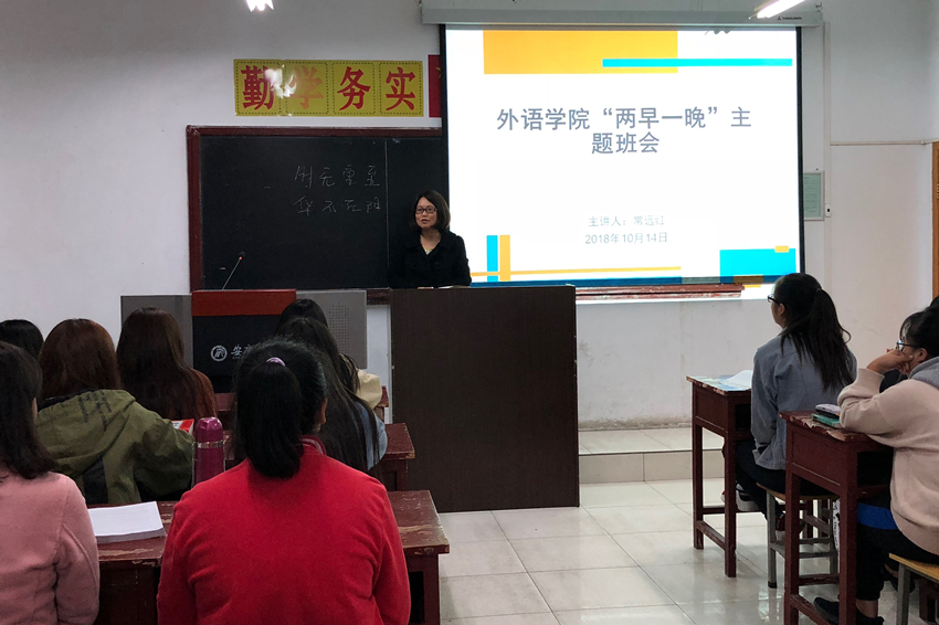 9月26日,外语学院学工办召开专题会议,团总支、学生分会干部以及各班班长和团支部书记参加大会。会上传达了学校《关于在学生中持续开展“两早一晚”活动的通知》精神,要求全院学生干部积极行动起来,以身作则做好模范带头作用,并全面组织和落实好此项活动。