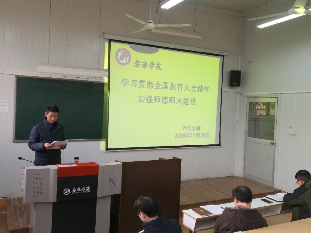 11月28日,外语学院全体教职工在6405教室召开贯彻全国教育大会精神暨加强师德师风建设学习会,学习会由院党总支书记郭家平主持。