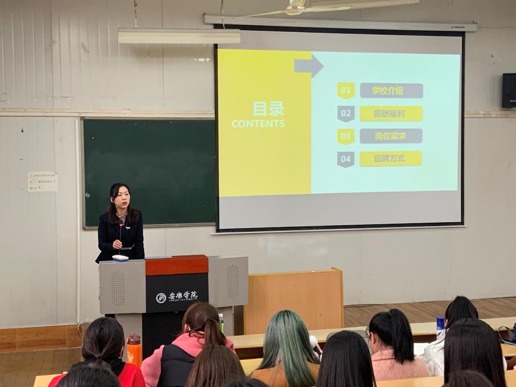 此次招聘会的主讲人为西安蒲公英(石泉)培训中心负责人许见,会上,许老师首先以学姐的身份为同学们简单分析了当前就业形势,分享了自己的创业就业经验。随后,她重点介绍了培训中心的基本概况和发展前景,以及同学们关心的应聘条件以及薪酬福利、发展机遇,同时也鼓励同学们要树立就业信心,转变就业观念,把就业看成是一个展现自己的平台,充分发挥自身才干。