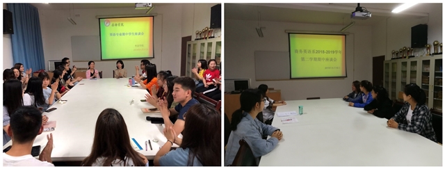 为保障外语学院日常教学质量的稳步提高,近日,外语学院英语系和商务英语系分别召开了期中学生座谈会。副院长胡卫卫、英语系系主任王欢、商务英语系系主任陈蕾及各系各年级各班学生代表参加了座谈会。会议由系主任主持。