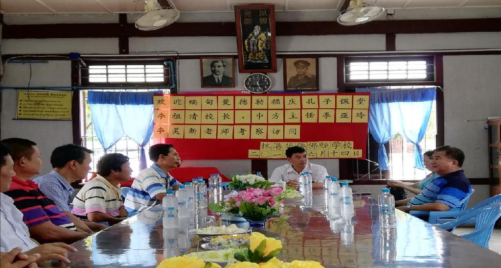 抹港华侨佛经学校王有龙校长代表董事会成员和全体教师对三位领导和老师远道而来的考察慰问表示热烈的欢迎,同时也对我院毕业生的工作表达了肯定,并希望他们在今后的工作中将中国的教学方法和教学经验分享给本土教师。