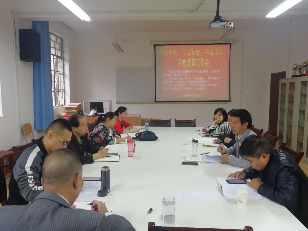 9月18日下午,外语学院中心组在6109室召开“不忘初心,牢记使命”主题教育学习研讨会,专题学习中央、省委、学校党委“不忘初心、牢记使命”主题教育会议精神,学院领导班子成员、工会主席、两办主任、系(教研室)主任、党支部书记、团总支书记等中心组成员参加了此次学习会。会议由党总支书记郭家平主持。