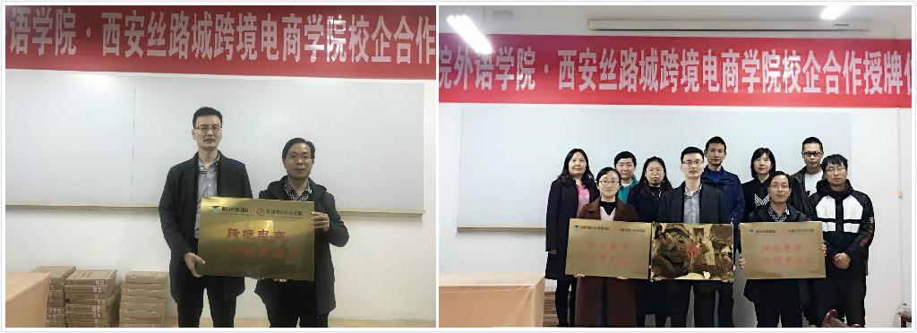 为进一步加强校企合作,推动商务英语专业建设,11月6日下午,外语学院•西安丝路城跨境电商学院校企合作授牌仪式在6109会议室隆重举行。外语学院党政领导、西安丝路城跨境电商学院总经理雷磊、人事主管胡娜文及外语学院中心组成员参加了授牌仪式。外语学院副院长张哲华向丝路城跨境电商学院授予了“跨境电商外语人才实习就业基地”牌匾,丝路城跨境电商学院同时向我院授予“跨境电商人才培训基地”牌匾。