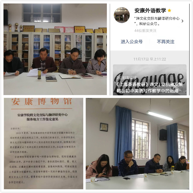 平台副主任贠旭做工作汇报发言。会议中,贠旭首先汇报了2019年度科研平台经费使用情况,并对照年初制定的任务清单相关内容,对外语学院课题申报立项、经费到账、论文发表、学术交流等工作做了分析。2019年以来,科研平台工作持续推进,参与社会服务工作多项,得到了安康博物馆等单位的来函表扬。在外语学院党总支的支持下,科研平台开办微信公众号“安康外语教学”,为师生推送各类学术资讯200余条,受到师生一致好评。针对科研平台存在的问题和今后发展计划,贠旭也做了说明,同时还对他在北京外国语大学访学情况做了简要汇报。