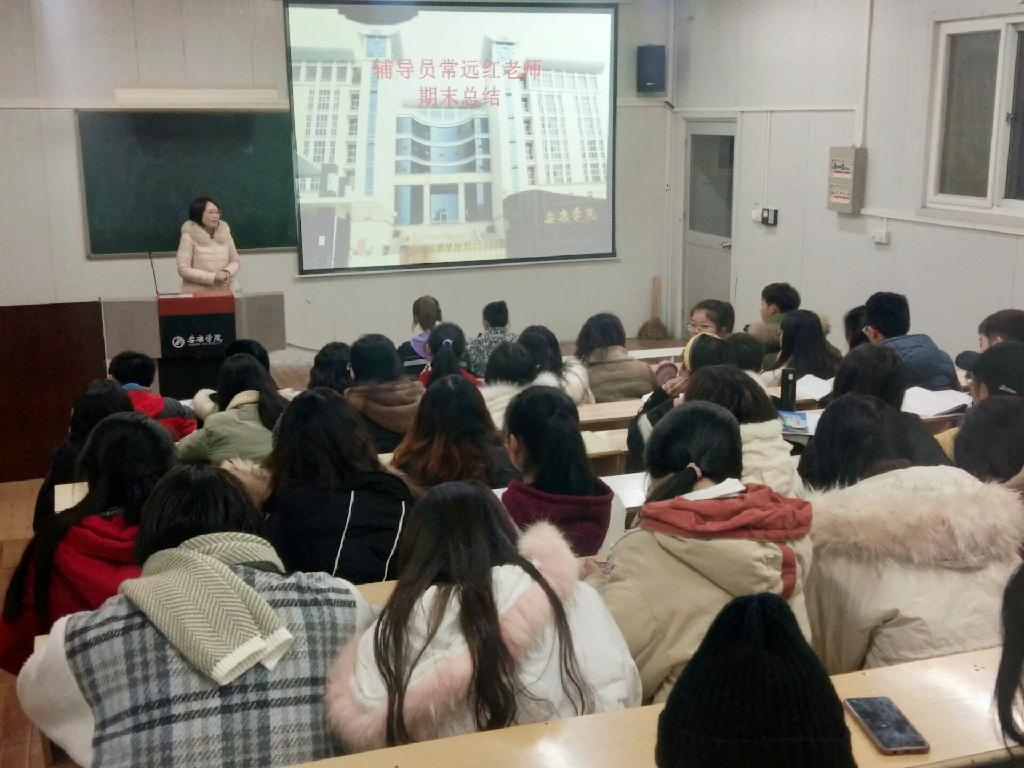 最后辅导员常远红,梁博文老师对班会进行总结,希望同学们能树立诚信考试的理念,在即将到来的期末考试中以积极饱满的态度,诚信应考,并祝大家考试顺利,取得优异的成绩。同时,对考试期间及寒假安全工作进行了安排,提出要求,希望同学们能够度过一个安全、愉快的假期。