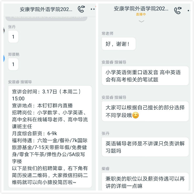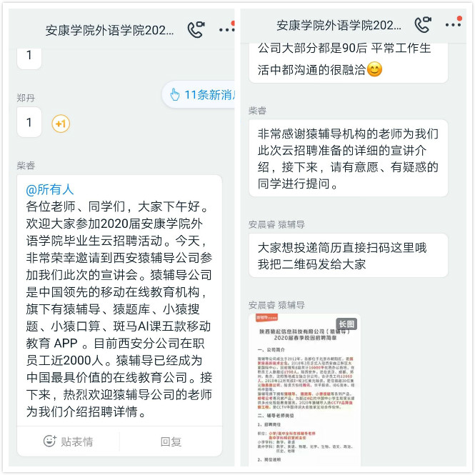 为切实帮助我院应届毕业生了解当前就业形势,同时也为毕业生提供与用人单位的交流平台,外语学院特地邀请到西安猿辅导公司为2020届毕业生进行招聘宣讲活动。由于目前正处于疫情防控阶段,特殊时期我院利用钉钉软件开展此次线上招聘会。招聘宣讲活动于2020年3月18日下午3点正式开始。