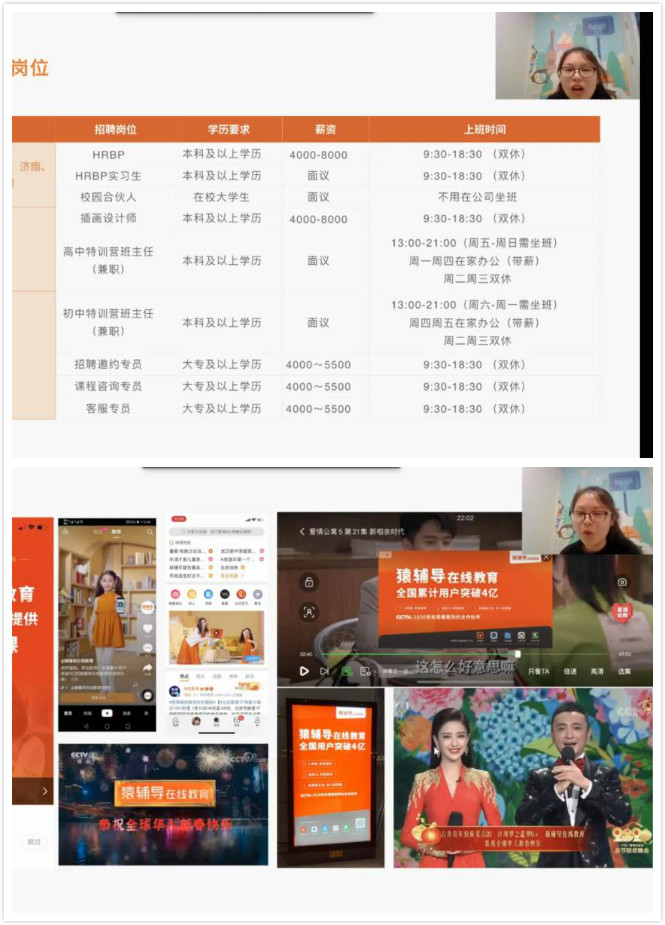 宣讲会上,猿辅导的老师通过图片、视频等形式对公司及整个团队进行了全面介绍;接下来,老师又就同学们关心的公司招聘要求、薪资及福利待遇、办公环境、公司氛围进行了说明;本次招聘共提供岗位数80人,其中小学英语约50人,高中英语约30人。小学英语招聘侧重口语发音,高中英语教师招聘侧重高考英语试题应试能力。最后,老师还详细介绍了面试流程。宣讲结束后,毕业生们都踊跃提问,积极地与宣讲老师交流沟通,老师们也对大家提出的疑问耐心作答。整个宣讲及招聘活动历时两小多小时,我院共110名学生参加,其中有18人投递简历,目前正在积极面试中。