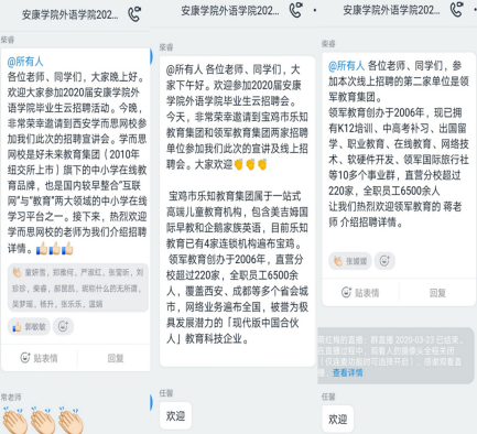 3月23日下午2点,由外语学院携手西安学而思网校、宝鸡市乐知教育集团、领军教育集团共同举办的线上招聘宣讲活动有序进行。辅导员常远红组织2020届毕业生68人参加了此次宣讲活动。