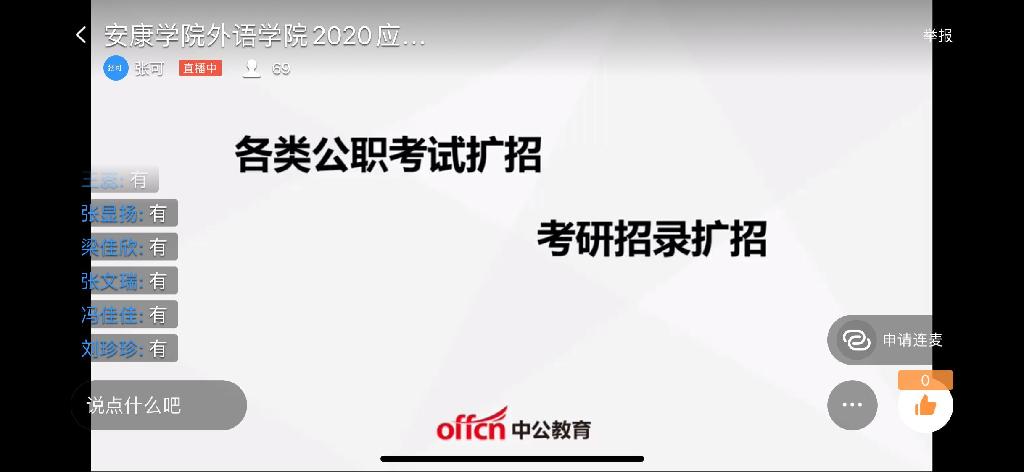 中公教育资深研究员张可老师首先分析了当前的就业形势,指出就业压力大和机会多并存的现状,传达了国家在疫情防控期间保障就业的相关文件和政策的精神以及指导意见,讲解了疫情期间所面临的就业趋势。随后,同学们就个人问题进行咨询。