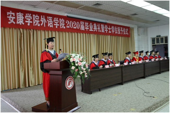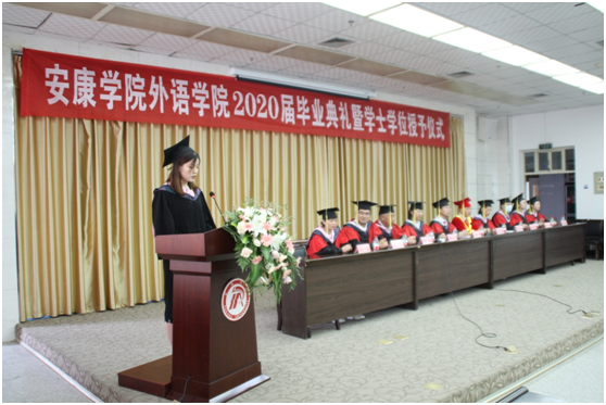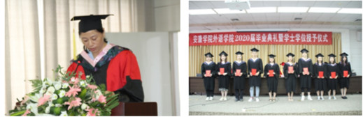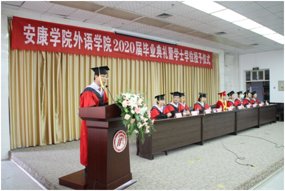 外语学院副院长张哲华(主持工作)为毕业典礼致辞,对毕业生顺利完成学业表达衷心祝贺,并带领同学们回顾在校的学习历程,感谢老师和同学们的辛勤付出,为学院取得了丰硕的成果和成绩;感谢同学们或率真或委婉的建议,激励学院将管理和服务不断完善,张院长饱含深情又风趣幽默的语言让师生们产生了共鸣,会场气氛高涨。张院长亲切叮嘱同学们,离开校园走向新的平台,要始终保有一颗进取的心,立足当下、远眺前方,坚守梦想、勇往直前,守住善的灵魂,做对社会有贡献的人。致辞结束后,张院长宣读了2020届毕业生学士学位授予决定。