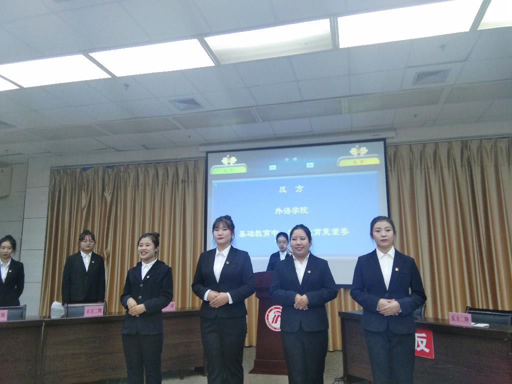 辩论赛是一场由教务处和团委联合举办的活动,旨在丰富校园文化生活,加强我校学风建设,提高学生的语言表达能力和临场应变能力,培养学生们团结协作意识,增强集体荣誉感。比赛由学校各二级学院组队参加,共分初赛和决赛两个阶段。外语学院代表队由2017