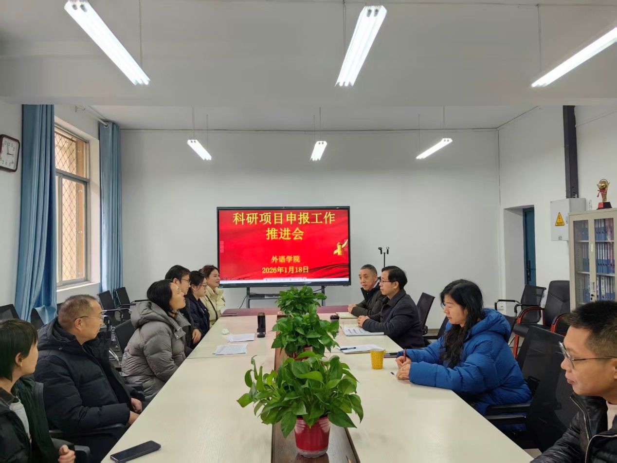 本次会议重点对外语学院2025年科研项目申报工作进行了总结回顾,充分肯定了全体教师在项目申报工作方面的积极表现,客观分析了科研项目申报书撰写质量方面存在的不足,并对做好2026年各级各类科研项目申报工作进行了安排部署。