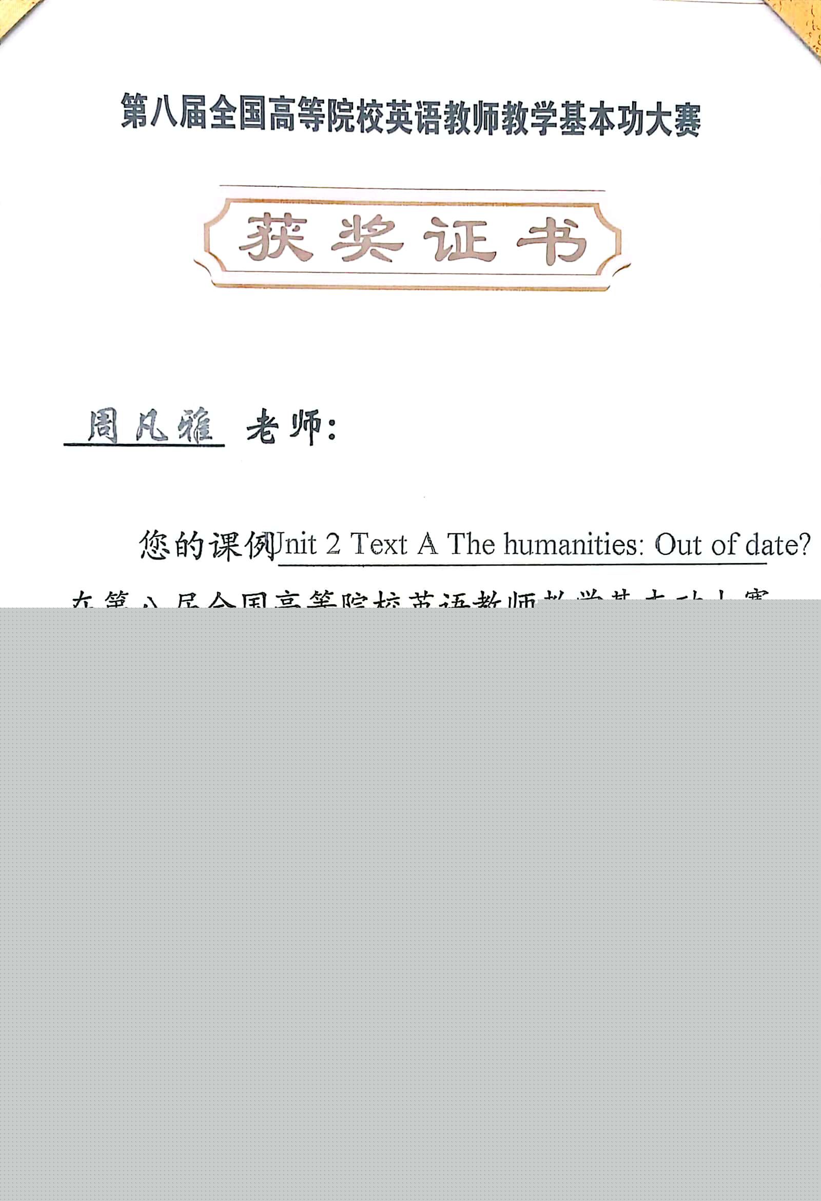 近日,由高等学校大学外语教学研究会、全国高等师范院校外语教学与研究协作组联合举办的第八届全国高等院校英语教师教学基本功大赛在杭州落下帷幕,我校外语学院教师周凡雅荣获优秀课例评比-实录课组陕西省二等奖。