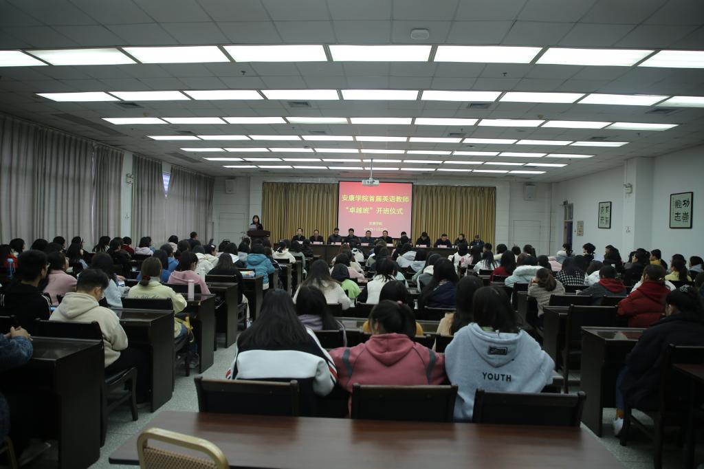 为响应国家卓越教师培养号召,积极践行《安康学院服务安康经济社会发展行动计划》,11月23日下午,安康学院首届英语教师卓越班开班仪式在江南校区图书馆报告厅隆重举行。副校长钟生海出席,校外教育实践基地代表汉滨高中副校长韦祖安、建民初级中学校长周章群、五里中心学校教研组长邓玉林、优秀校友代表安康市电教馆副馆长毛军应邀参加了开班仪式,我校团委、教务处、信息化处等职能部门负责人、外语学院领导班子、教师教育团队教师及首批卓越班学员参加了活动。开班仪式由外语学院副院长胡卫卫主持。