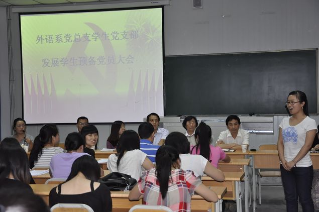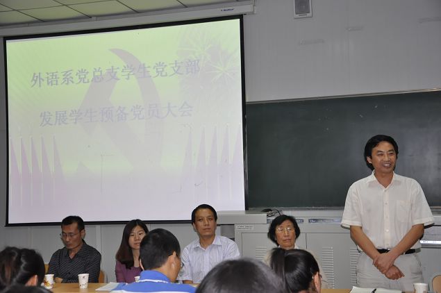 5 月 31 日晚,外语系党总支学生党支部在1012教室召开了发展学生预备党员大会。学校返聘专职组织员刘琳老师、学校宣传部部长李新安老师、系党总支书记李延福老师以及学生入党介绍人和全体学生党员共100余名师生参加了本次大会,会议由学生党支部书记周静主持。