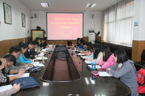 为进一步深化“五联共建”活动,在党员领导干部联系基层、联系师生、服务师生上求实效,10月21日下午,外语系党总支与机关二党支部在学校江南校区第一会议室召开了深化“五联共建”领导干部联系服务师生工作安排部署会。机关二党支部与外语系党总支领导班子成员、联系班级的班长、宿舍舍长等20余名师生参加了会议。会议由外语系党总支书记李延福主持。