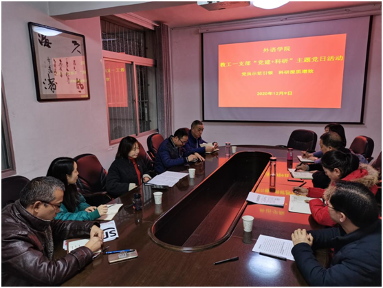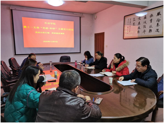 活动中,陈玉平领学了教育部高等教育司司长吴岩“新使命 大格局 新文科 大外语”的主旨发言,外语学院党总支副书记张哲华结合大文科、硕士点申报、岗位聘期任务、重点就本年度科研目标任务及完成情况等做了介绍,指出了存在的问题和努力方向;一支部党员围绕第四轮岗位聘任条件,现场讨论汇报了近三年来的科研方向和成果,科研到账经费等情况,重点反思和剖析了个人在科研方面存在的不足与原因,提出了未来科研能力提升计划;陈玉平、贠旭、刘子富等同志分享了个人的科研规划、科研思路和完成过程等经验,与会人员就某些难点问题展开讨论交流。