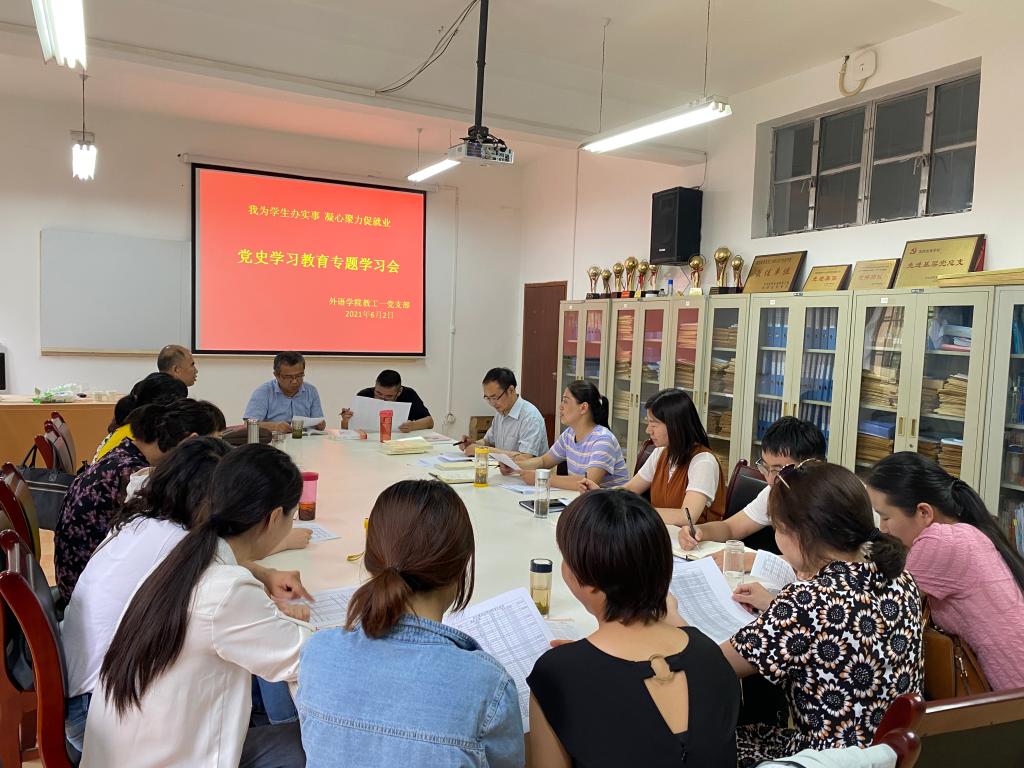 为深入贯彻落实《安康学院“我为群众办实事”实践活动工作方案》和《外语学院“我为群众办实事”实践活动工作方案》,结合当前工作实际,外语学院教工一党支部6月2日在6109召开了“我为学生办实事凝心聚力促就业”为主题的党史学习教育专题工作会议,全体党员、英语系、商务英语系全体教师参加了本次专题学习会。学习会由党支部书记陈玉平主持。