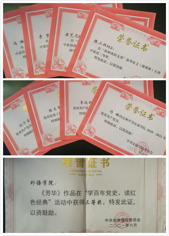 此外,在学校“辉煌百年·七个一”系列活动中,我院获得“党建知识竞赛优秀组织奖”、“‘我和我的支部’故事征文(微视频)大赛优秀组织奖”;在“学百年党史、读红色经典活动中,外语学院参赛作品《芳华》获得比赛三等奖”;在“安康学院‘我和我的支部’故事征文(微视频)大赛中,教工二党支部陈小红同志的作品《我和我的支部》(微视频)获得三等奖”,教工一党支部冯琳、教工二党支部梁艺凡、学生党支部李梦等3名同志的作品分获优秀奖。