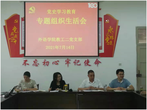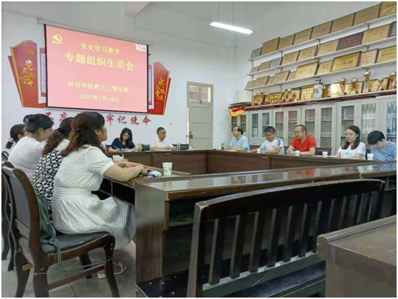 7月14日上午,外语学院教工二党支部在体育馆一楼会议室组织召开了党史学习教育专题组织生活会,会议由党支部书记刘子富主持。