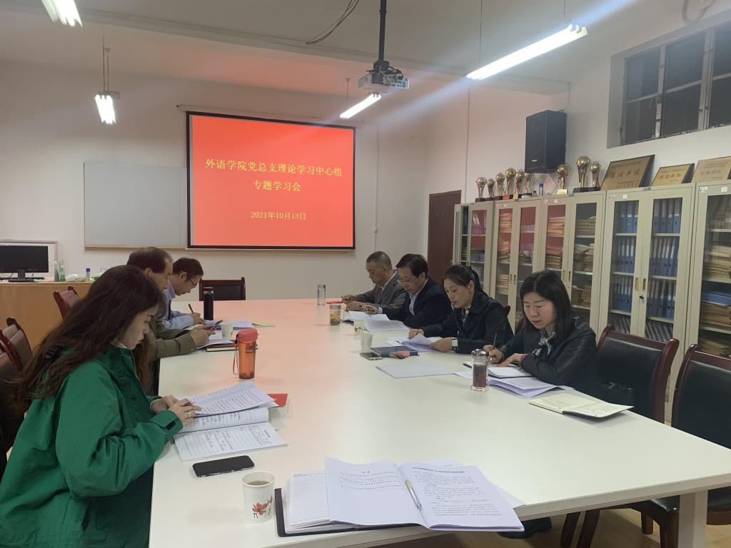 10月13日下午,外语学院在6109室召开理论学习中心组集体学习会。学院中心组成员参加了会议,会议由党总支书记肖红香主持。