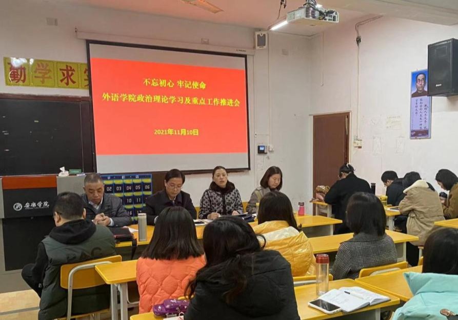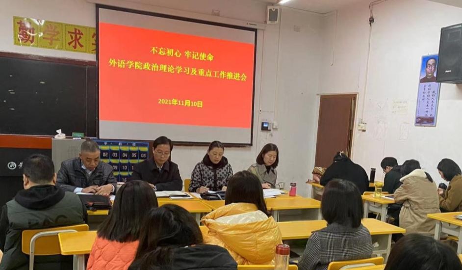 11月10日下午,外语学院在6107召开政治理论学习会议,学院领导班子、全体党员干部、全院教职工参加了学习会。学院领导班子、全体党员、全院教职工参加了会议。会议由党总支书记肖红香主持。