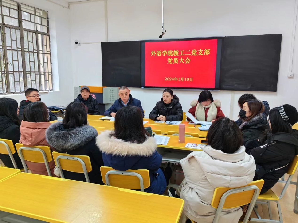 2024年1月18日下午,外语学院教工二党支部在6107教室召开党员大会,支部全体党员同志参加,会议由党支部书记刘子富主持。
