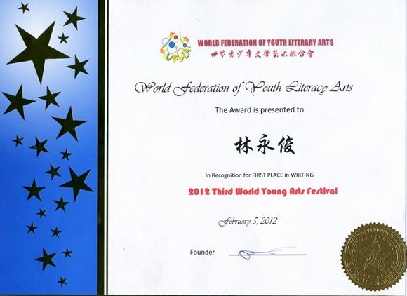 外语系09级英语教育专业林永俊同学作品《五份》在第三届世界青少年艺术节中荣获写作组冠军。