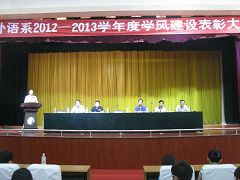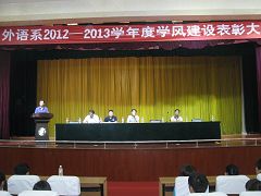 7月2日下午,外语系2012-2013学年度学风建设表彰大会在江南校区大礼堂隆重举行,系主任哈红光、党总支书记李延福、大学英语教学部主任李继平、副主任张哲华、辅导员杨厚东及全系500余名学生参加了表彰大会,大会由系学工办主任任森龙主持。