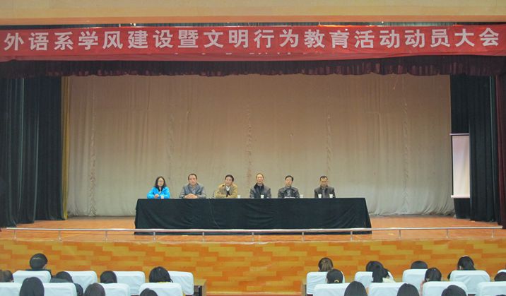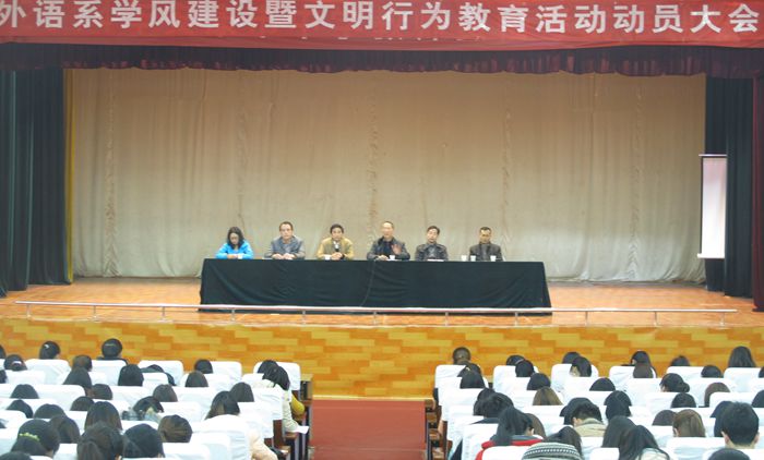 3月11日晚,外语系在江南校区大礼堂召开了学风建设及文明行为教育活动动员大会。学校学工部部长郑树青,外语系党总支书记李延福、副主任张哲华、辅导员杨厚东和常远红以及全系学生参加了大会。大会由系学工办主任任森龙主持。