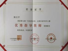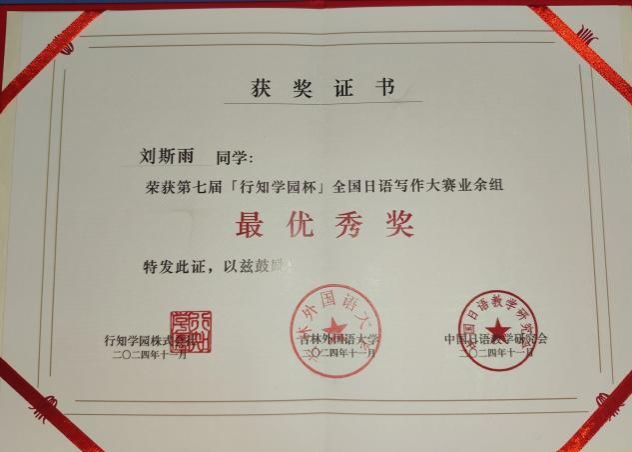 近日,第七届“行知学园杯”全国日语写作大赛成绩揭晓。我院学生刘斯雨从全国一百余所高校的1340名参赛选手中脱颖而出,获得业余组“最优秀奖”,陈玉平老师获得“优秀指导教师”荣誉称号。