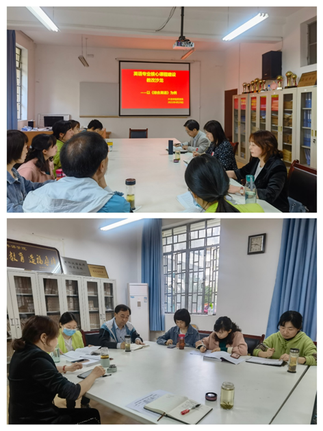 4月28日下午,外语学院英语系在6109举行了英语专业核心课程建设教学沙龙活动。沙龙由英语系主任周玫主持,副院长胡卫卫和英语系全体教师参加了此次活动。,校督导哈红光教授应邀莅临指导。