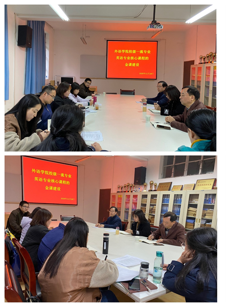11月18日下午,外语学院英语系在6109举行了主题为“校级一流专业英语专业核心课程的金课建设”教学沙龙活动。沙龙由英语系主任周玫主持,英语系全体教师参加,校督导哈红光教授、学院督导组长陈平教授应邀莅临指导。