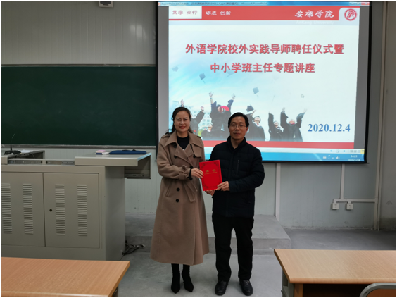 为提高我院英语师范生立德树人,践行师德的中小学教师职业意识,强化教师职业信念和职业认同,增强综合育人经验和能力,12月4日下午,外语学院特邀安康市汉滨区果园小学副校长、98级优秀校友钱静老师,为我院英语师范生和英语教师卓越班学生举办了“班级文化建设”的中小学班主任专题讲座。