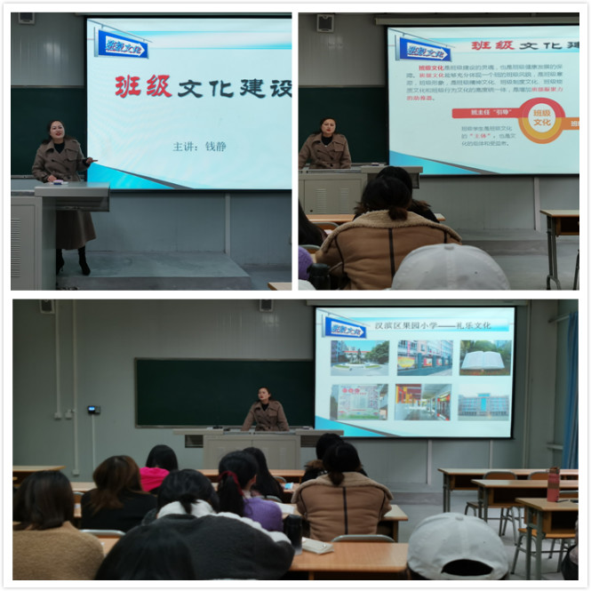 讲座中,钱静老师主要从班级文化的构建,班级文化的影响因素以及班级的制度文化等方面为同学们做了详细讲解。钱老师指出,班级文化是在班主任引领下在班级内部形成的特有的作风和行为准则,是班级灵魂的独特展现。中小学班级文化对学生的健康成长和全面发展有着重要的影响,是学生道德品质教育的主要渠道,对形成良好的班风具有重要意义。同时,钱老师还介绍了汉滨区果园小学特色文化——礼乐文化等。