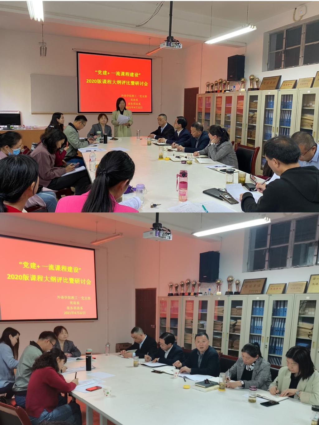 为切实做好期中教学自查工作,加强教学过程管理,提高教学质量,自4月20日起,外语学院启动了本学期期中教学各项自查工作。4月22日下午,外语学院在6109开展了2020新版课程教学大纲自查暨评比研讨活动。校党委副书记胡波、学院班子成员、校督导哈红光、院督导组长陈平及外语学院英语系、商务英语系全体教师参加了本次活动。