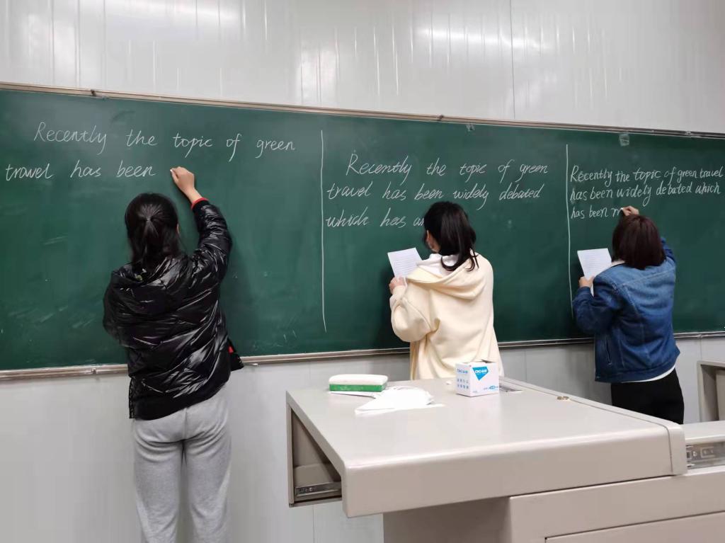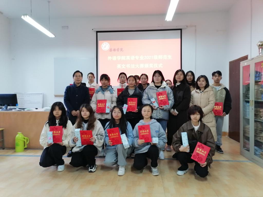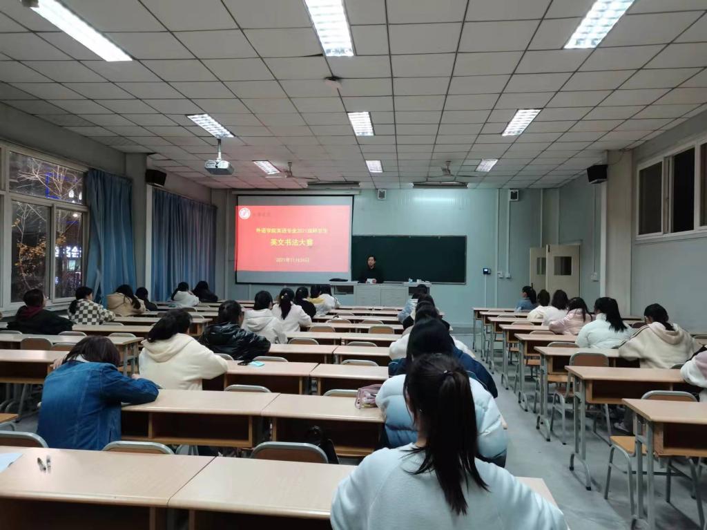 为贯彻落实应用型外语人才培养理念,促进师范生培养质量逐步提升,助力师范生以赛促学,以赛促练,增强其教师职业基本功,11月28日晚,外语学院在1022教室举办了2021级英语专业师范生英语书法大赛。院长张哲华、副院长胡卫卫、系主任周玫、青年教师袁昌丽等担任评委。