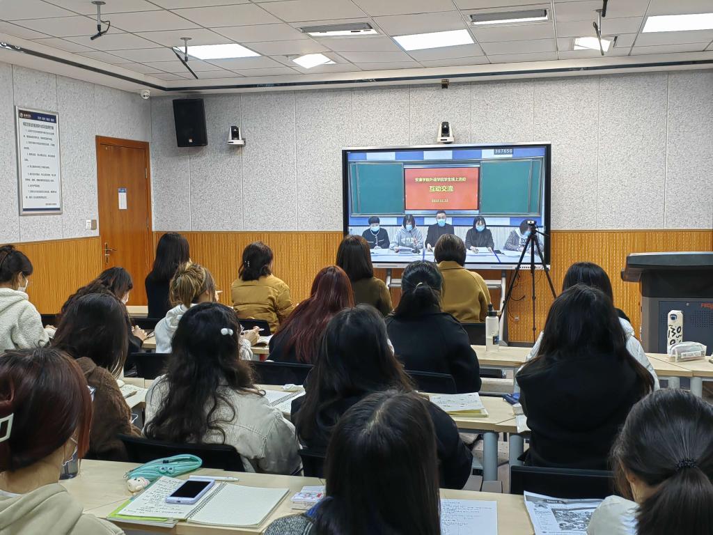 教研环节,两位老师分别进行了说课。外语学院教学副院长胡卫卫、姜国波副教授、教师团队袁昌丽老师就中学英语课堂情感教育价值观的渗透、课程思政活动的设计及2022版英语新课程标准进行了深入交流。师范生就课堂教学设计和实施、以及观摩中产生的思考等问题与两位教师在云端进行了热烈有效的讨论互动。
