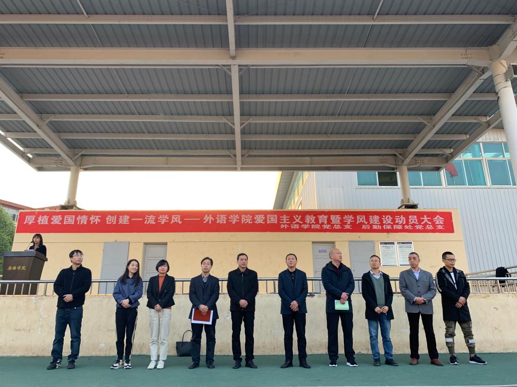 为深入贯彻落实习近平总书记对教育的重要论述和对青年的寄语要求,全面贯彻落实学校学风建设推进会议精神,充分发挥直属党支部和二级学院党总支“结对共建”作用,深入推进“党建+X”和“五联五做”工作模式,外语学院党总支和后勤保障处党总支以“厚植爱国情怀 创建一流学风”为主题,于11月14日下午在江南校区操场隆重召开外语学院爱国主义教育暨学风建设动员大会,在学生中深入开展爱国主义教育,共同助力外语学院创建一流学风。校党委副书记胡波出席大会并讲话。学工部、后勤保障处党总支相关负责同志,外语学院领导班子、党支部书记、系主任、两办主任、辅导员和全院师生参加了会议,会议由外语学院党总支书记肖红香主持。