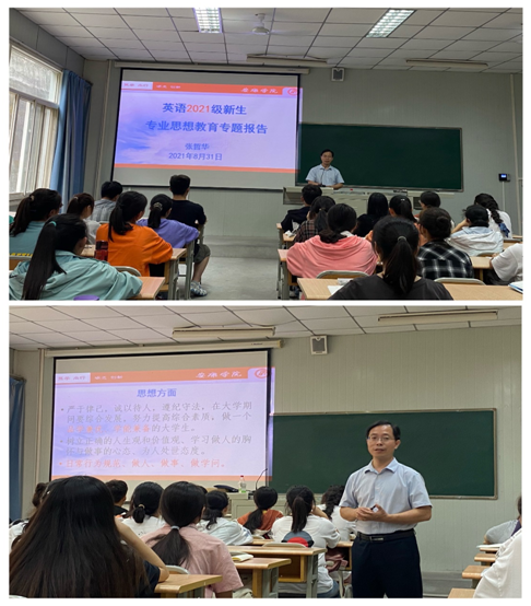 第一次讲座分别由外语学院副院长张哲华(主持工作)和副院长胡卫卫主讲。张院长和胡院长分别为英语专业和商务英语专业学生介绍了外语学院发展历程,办学条件、师资队伍(教学团队)、解读了人才培养方案、毕业与学位要求、专业发展规划和就业前景等。并与学生分享了党的十八大以来,习近平总书记关于青年工作的重要论述,鼓励学生珍惜大学时光,勇挑重担,努力学习,健康生活,不负韶华。