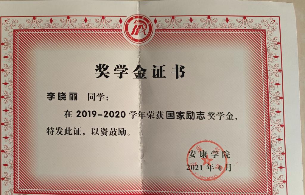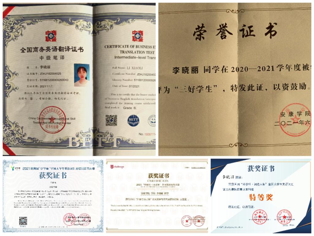 李晓丽,女,中共预备党员,外语学院2019级商务英语专业1班学生。“不忘初心,砥砺前行”,她连续两学年学业成绩和素质综合成绩均名列专业第一,获2019-2020学年国家励志奖学金、2019-2020学年安康学院优秀团员、2020-2021学年安康学院三好学生。获首届“外教社词达人杯”陕西赛区特等奖、第五届全国高校商务英语竞赛初赛一等奖、第四届“亿学杯”词汇大赛省二等奖、双百杯扶贫产品创意营销大赛校级初赛三等奖,考取普通话证书、英语四、六级证书、英语专业四级证书、全国商务英语翻译中级笔译证书,获得2020-2021学年国家奖学金。