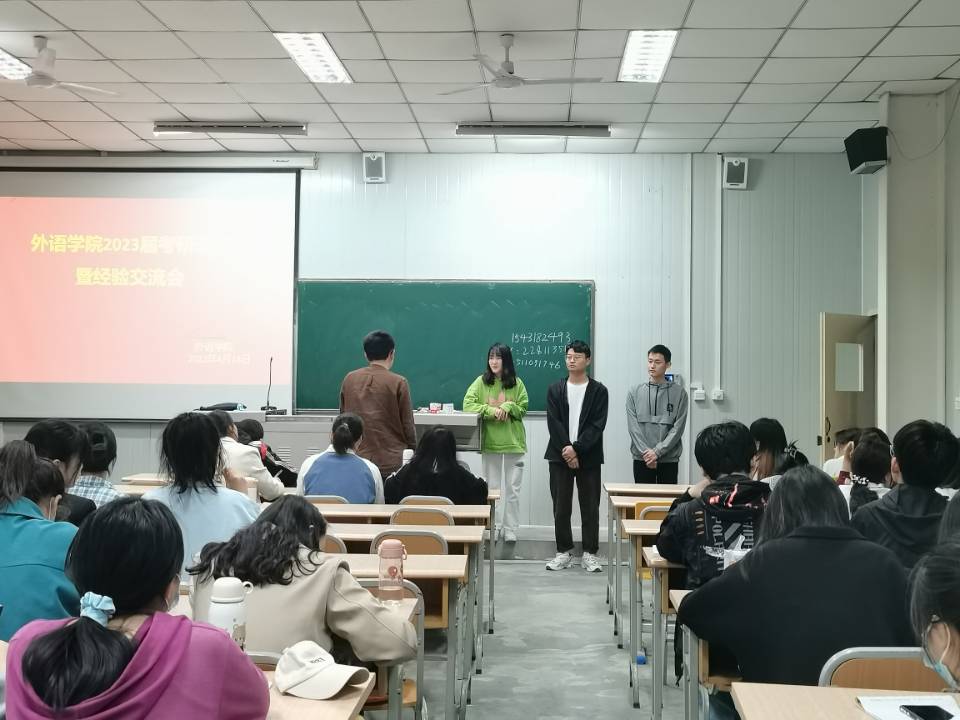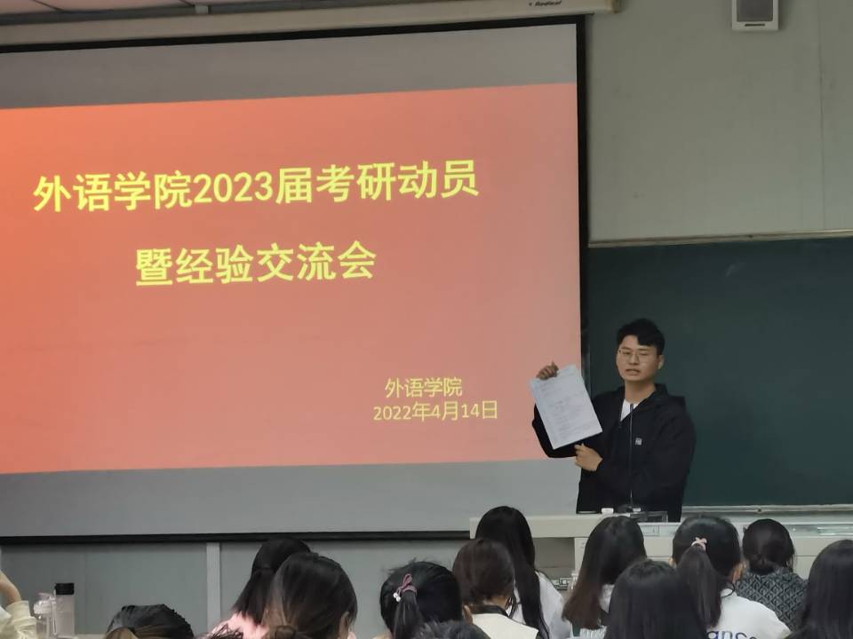 为了推动外语学院高质量人才培养,促进高质量就业,引导我院学生能够充分了解考研的意义和策略,4月14日下午,在十号教学楼1014、1028教室,我院为英语专业2019级、2021级专升本学生搭建考研交流平台,特邀2022届学科英语、马克思主义理论、法律(非法学)不同专业拟录取的三名毕业班学生朱晨、魏东、冷茜进行考研经验分享交流。此次交流会由外语学院院长张哲华主持。
