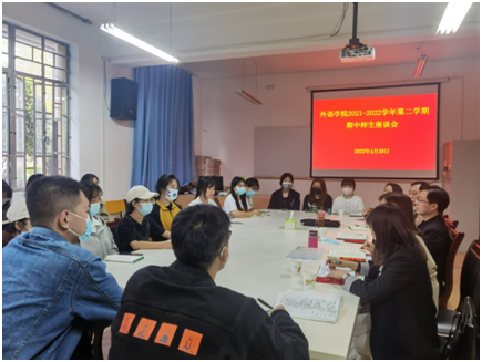4月20日下午,外语学院召开2021-2022学年第二学期期中师生座谈会。师生代表齐聚一堂、畅所欲言,分享交流本学期的学习及生活感受,对学院发展建言献策。院长张哲华、副院长胡卫卫、校级督导哈红光、院督导组长刘燕、系主任、辅导员及各班学生代表参加了座谈会。会议由英语系主任周玫主持。