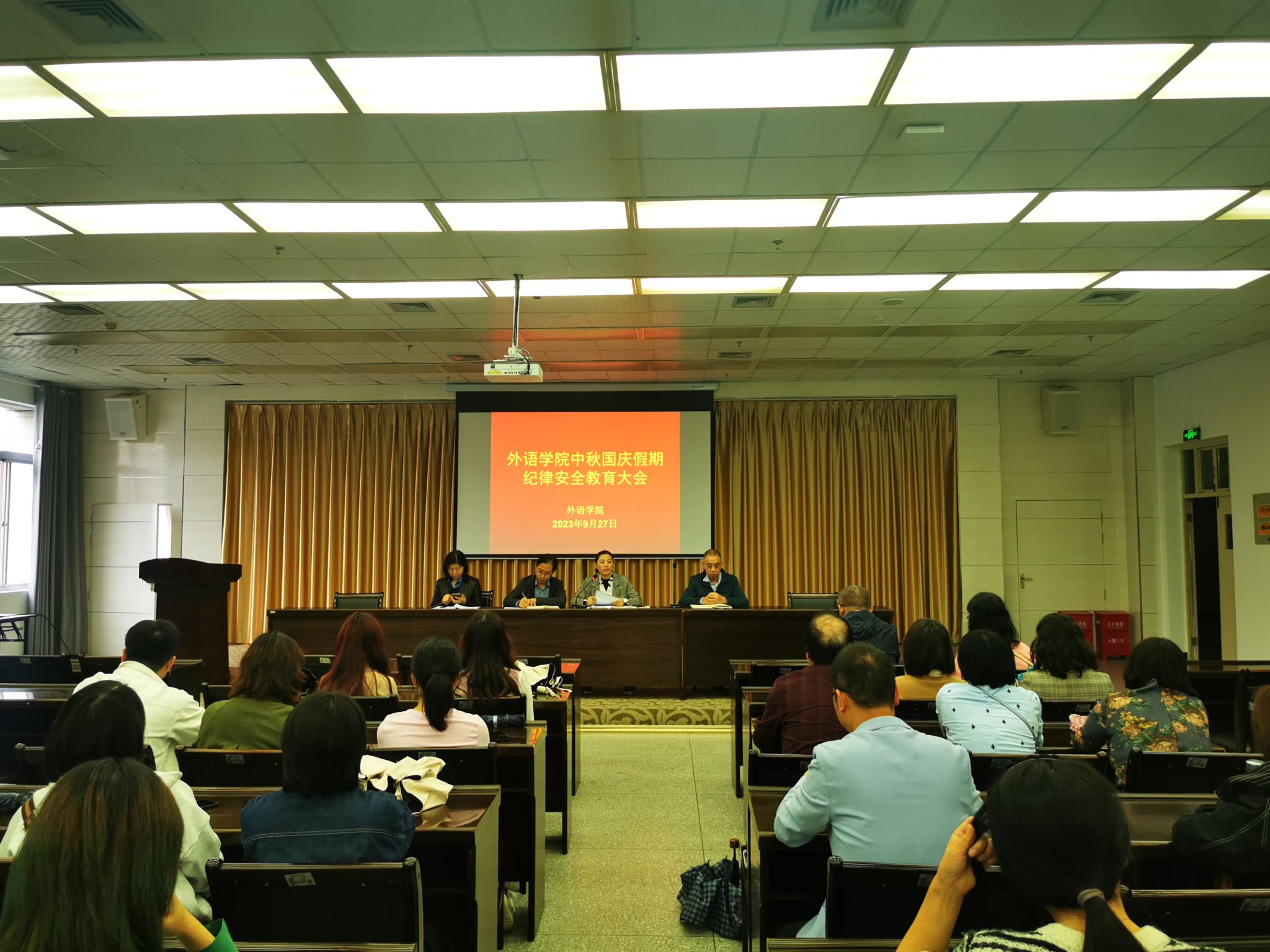 为提高安全防范意识,保障师生生命财产安全,度过安宁祥和的中秋国庆假期,9月27日下午,外语学院在图书馆报告厅召开了中秋国庆假期纪律安全教育大会。外语学院全体教职工、各班班长、团支书及2023级新生参加了大会。大会由党总支书记肖红香主持。